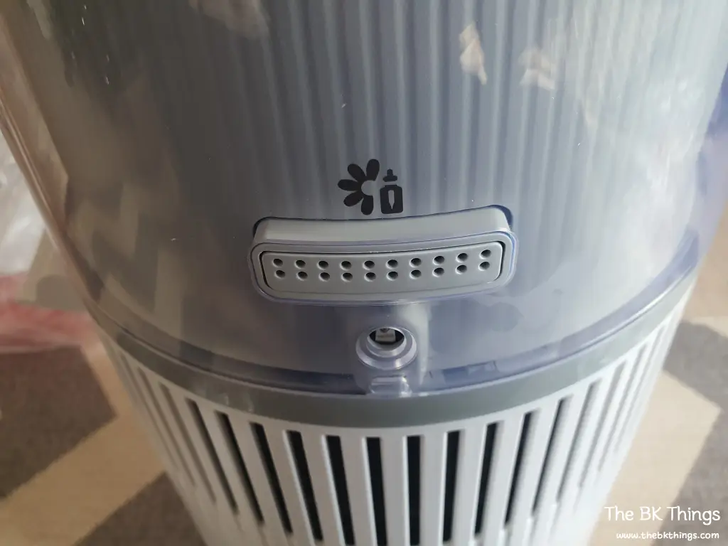 Looking at the underside of the top unit, there’s nothing special. There’s a gold-colored part on one side that seems to act as a sensor to check if it’s connected to the bottom. In the center, there is a fan. It seems this fan spins to evaporate the water naturally.