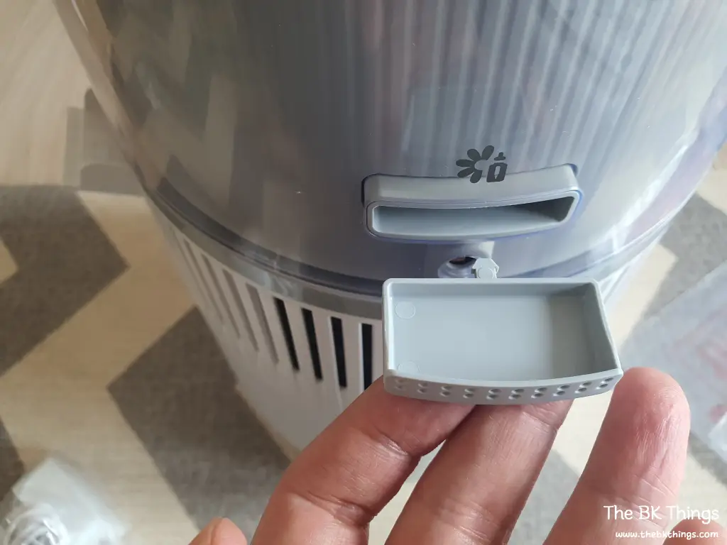 The bottom part has nothing in it—it’s just a water tank. You can fill it up to the water level line for a maximum of 4.5L.